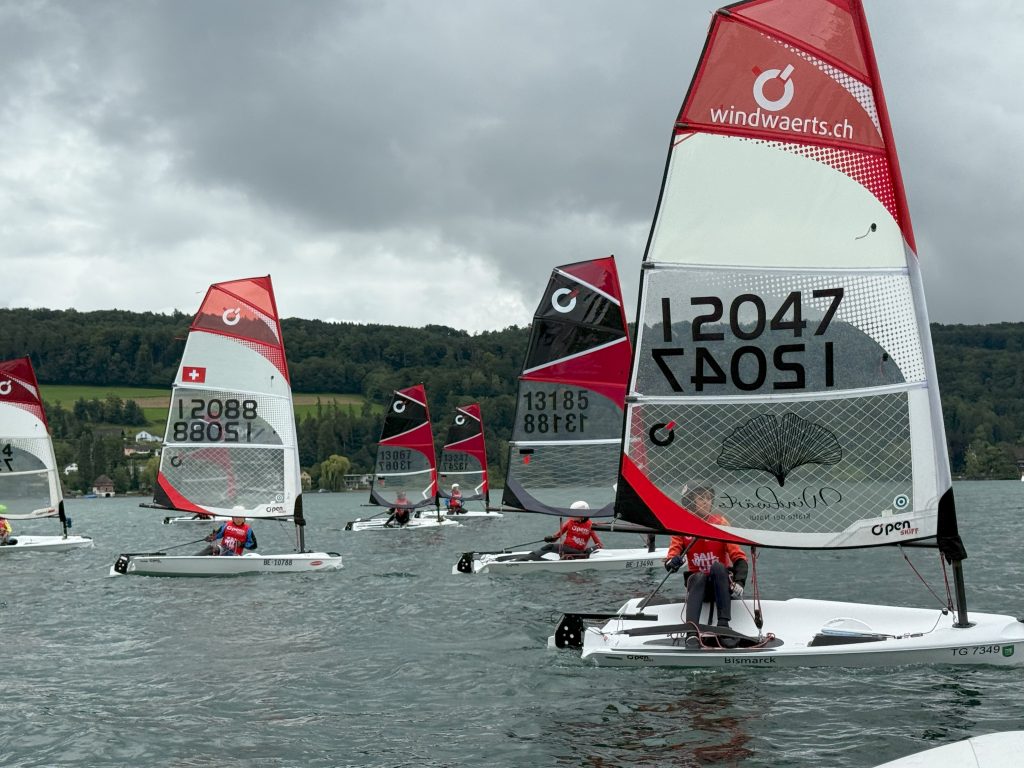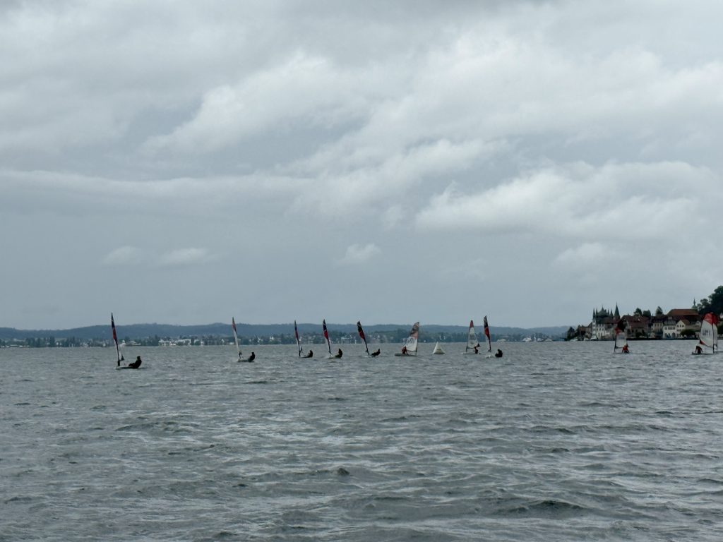 Am ersten Regattamorgen starteten wir mit einem schönen Frühstück. Danach fuhren Mila, Kolja und ich mit dem Fahrrad in den ca. 800 m entfernten Segelverein, wo wir noch Daniel und Samuel aus Deutschland trafen. Direkt bei der Anmeldung fiel mir die entspannte und freundliche Art des Schweizer Regattateams auf und sie hießen uns herzlich willkommen.